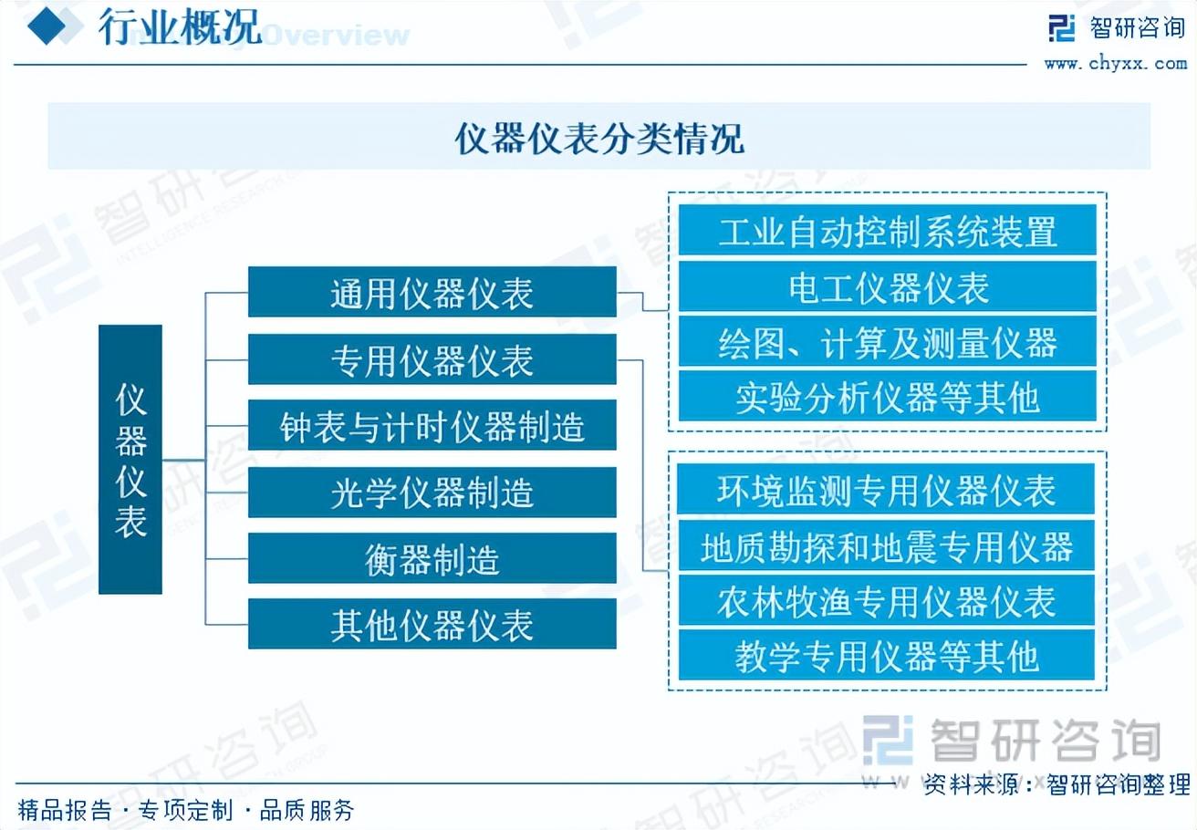 仪器仪表产业链情况而言,主要包括五金件、电子元器件、传感器等零部件和相关生产设备;中游仪器仪表生产按照分类可分为通用仪器仪表和专用仪器仪表等;下游广泛应用于机械、电力、汽车、电子通信等各行业各业,是感知物理世界的终端工具,是制造系统、物联网等大规模复杂系统的“眼睛”、“鼻子”、“耳朵”和“皮肤”,是科学研究和工业生产的基础支撑。