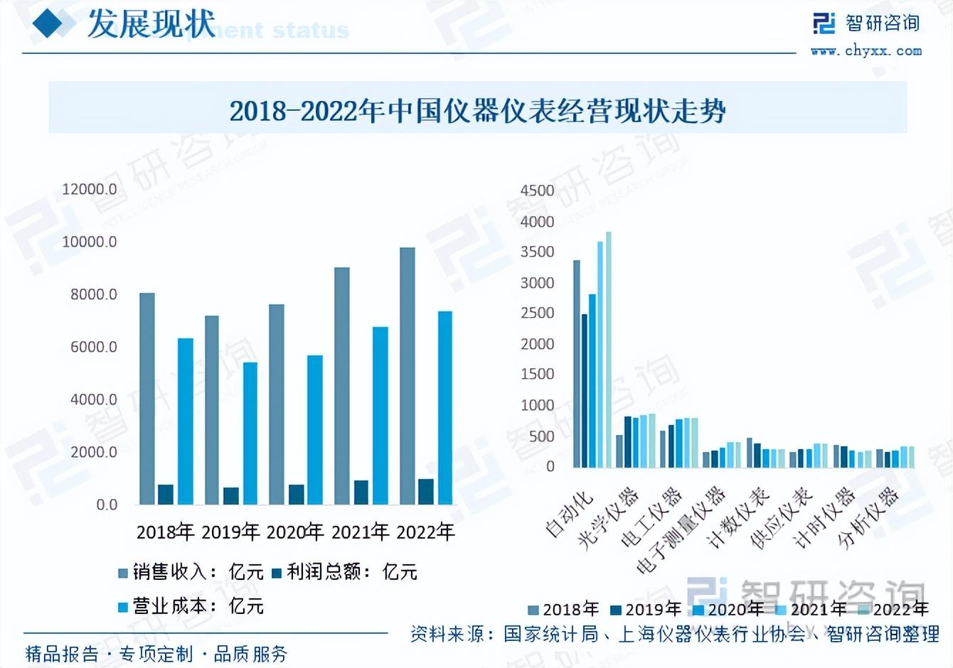 我国仪器仪表产业现状而言,国家对仪器仪表行业高度重视,相关政府部门通过智能制造专项、工业强基工程、工艺“一条龙”应用计划示范、“十三五”先进制造技术领域科技创新专项、“重大科研仪器设备开发”重点专项、“重大科学仪器设备研制”专项等项目以及支持行业优秀企业证券市场上市、融资,对行业给予了政策、资金上的大力支持。我国仪器仪表行业在国家的大力支持下持续向好,营业收入从2018年的8091.6亿元增长至2022年9835.4亿元,利润总额从2018年的780.5亿元增长至2022年的1017.6亿元,2022年营业成本约7410.1亿元。