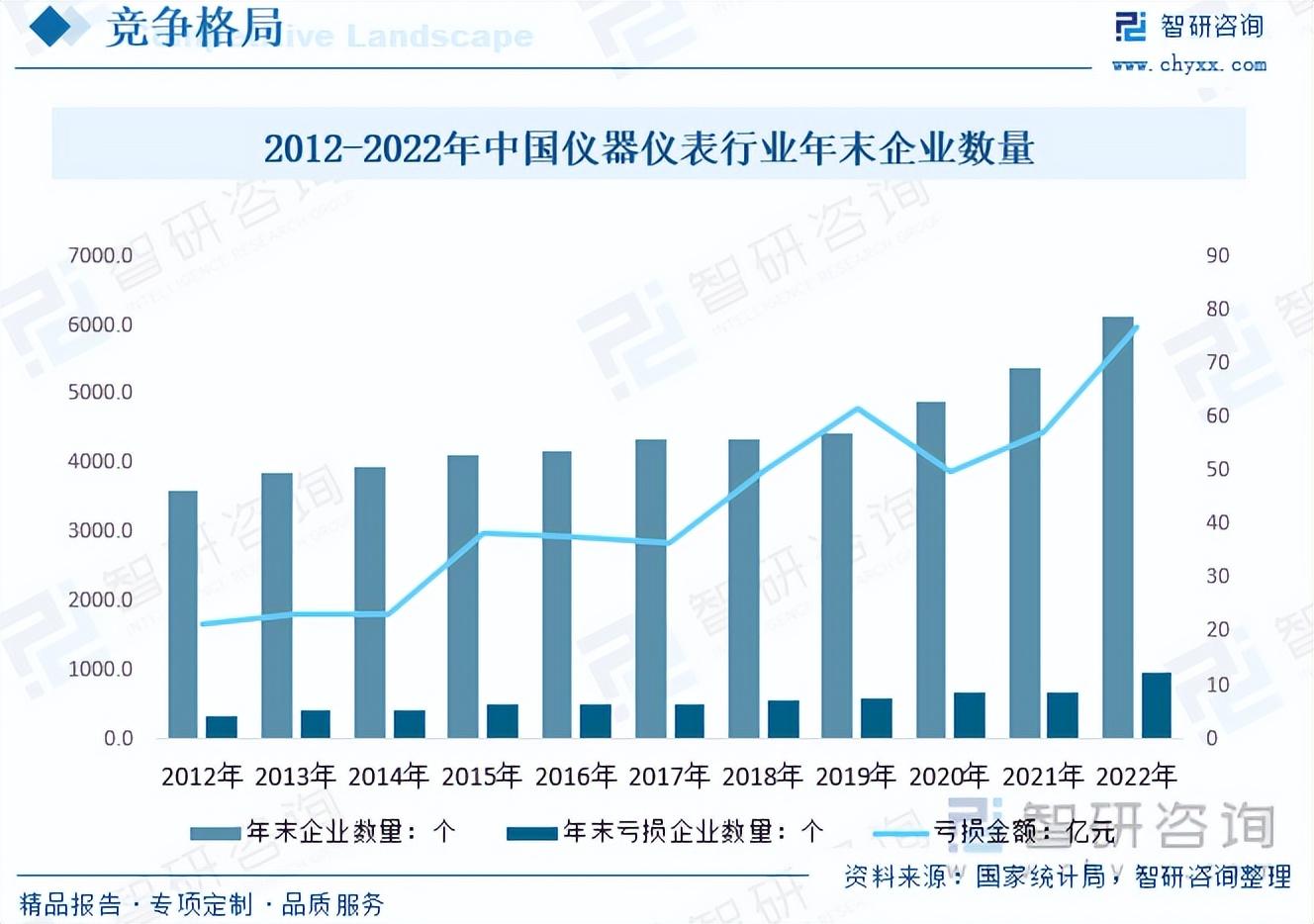 受益于中国经济的持续增长,特别是制造业、教育科研领域的快速发展,中国仪器仪表产业行业规模不断提升,中国已成为世界发展中国家中,仪器仪表产业规模最大、产品品种最齐全的国家。中国仪器仪表产业在传统产业应用和中低端产品具备较强竞争力,并在一些高端仪器仪表设备研发生产上取得了突破,但是国外企业在高技术领域和中高端产品仍具有优势。随着各行各业整体仪器仪表种类需求持续增长,叠加政策和下游需求推动行业高端国产化替代加速,我国仪器仪表企业数量持续增长,数据显示,截止2022年末我国仪器仪表企业数量达6132家,其中亏损企业数量达965家,亏损金额达76.8亿元,主要受2022年国内主要地区疫情反复导致。