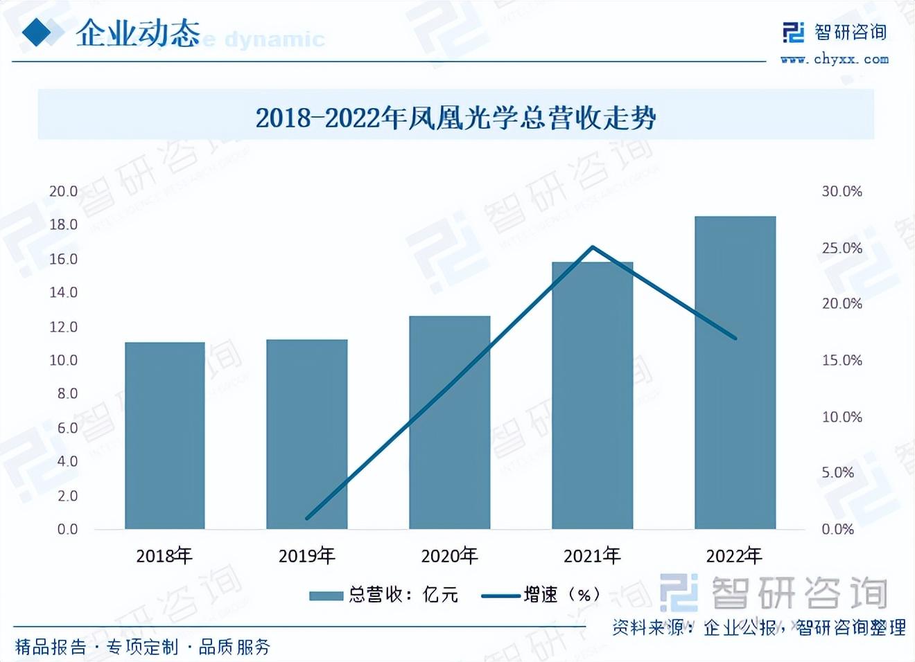 凤凰光学是一家集研发、设计、制造一体化的精密加工、光学组件国内重要供应商,主要产品包括光学组件、精密加工、光学仪器等。就其经营状况而言,随着整体需求光学组件和光学仪器需求带动,凤凰光学总营收从2018年的11.17亿元增长至2022年18.65亿元,光学仪器产销量2022年分别为14.39万只和14.40万只,分别较2021年增长20.32%和24.62%,光学仪器营收约0.51亿元。