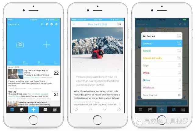 Day One 是iPhone / iPad / Mac 平台下的一款笔记软件。它简洁的界面广受人们的喜欢,而最新版的2.0,而且也提供了同步功能,它还可以配合iCloud 和Dropbox 使用,和IFTTT 配合有更多好玩的事情。而且它还可添加定位,可以使用日历模式,而且底部的导航栏,可以让你快速切换到各种样式的Timeline,比如图片,地图,日历。