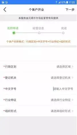 首先要为个体工商户设定一个名称,名称由行政区划、中文字号、行业特征和组织形式四部分组成。系统检查名称是否包含禁用字、限用字,是否与其他主体名称近似。