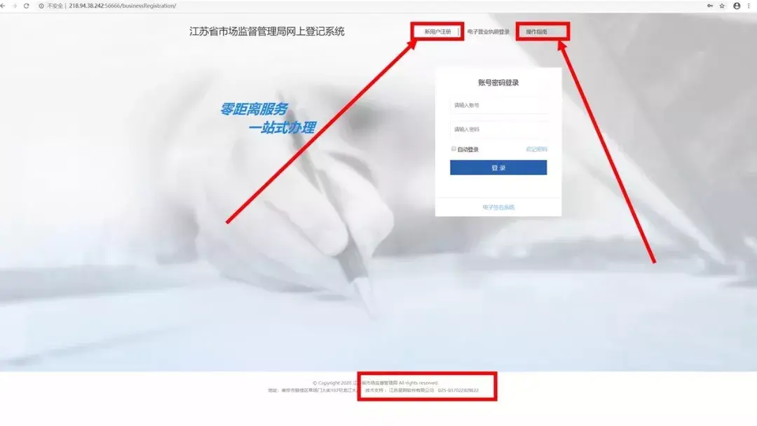 使用IE8及以上版本浏览器,输入网址(http://218.94.38.242:56666/businessRegistration/home/login.jsp),直接登录“江苏省市场监督管理局网上登记系统”。