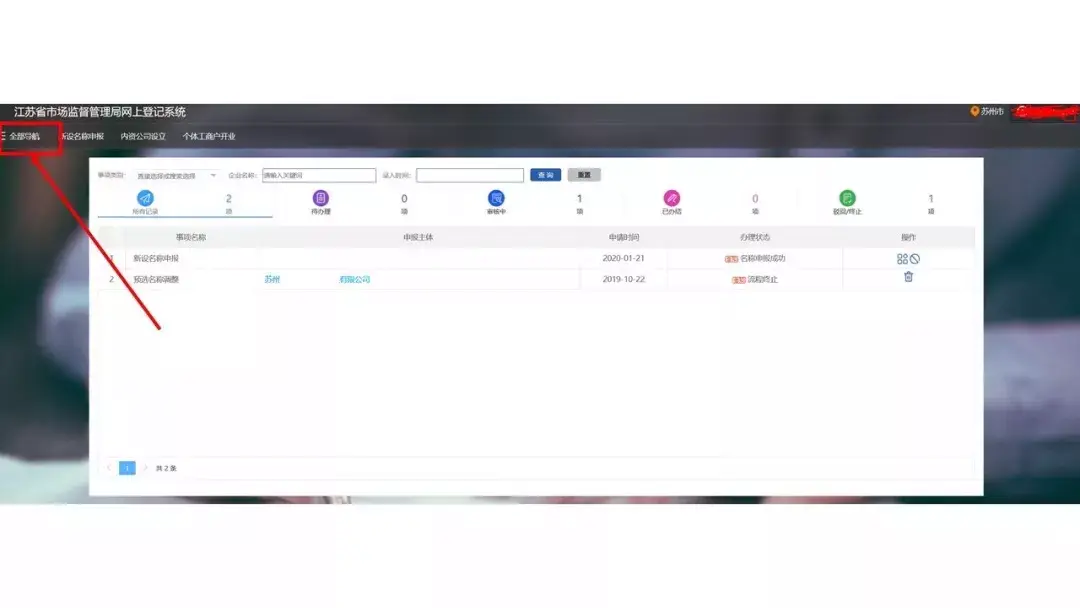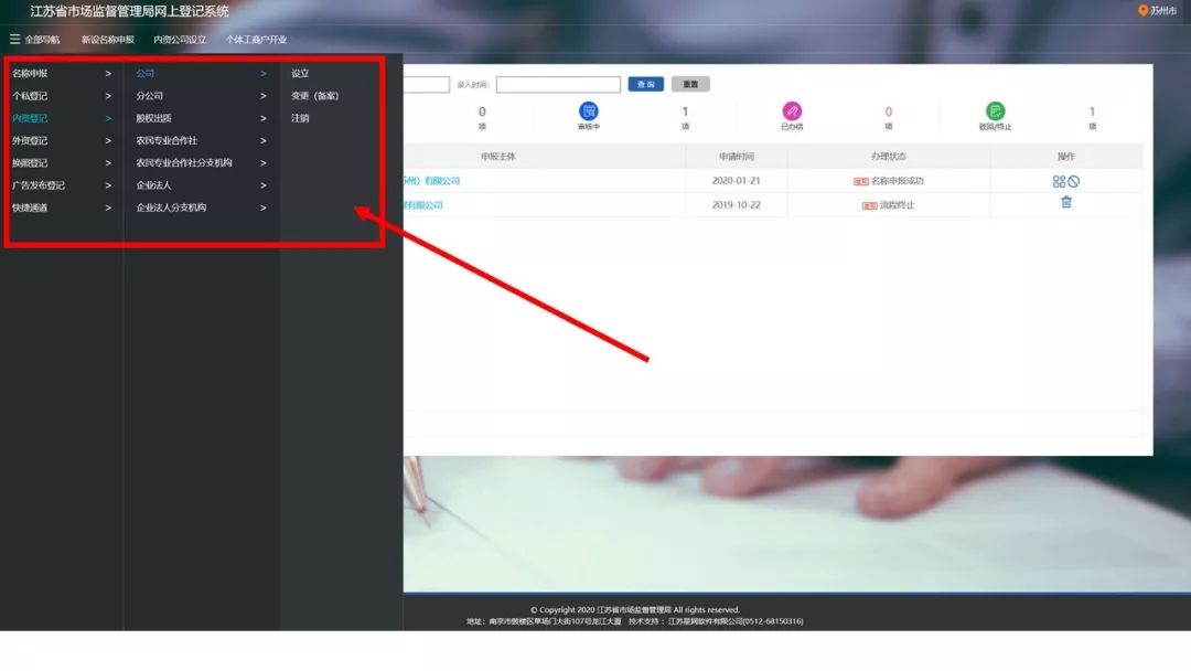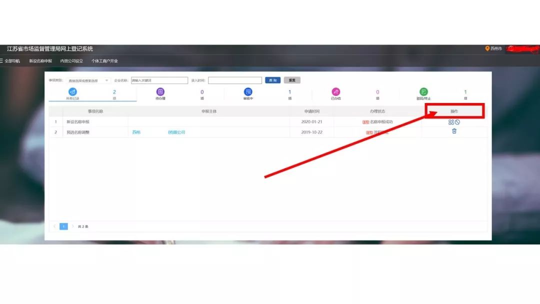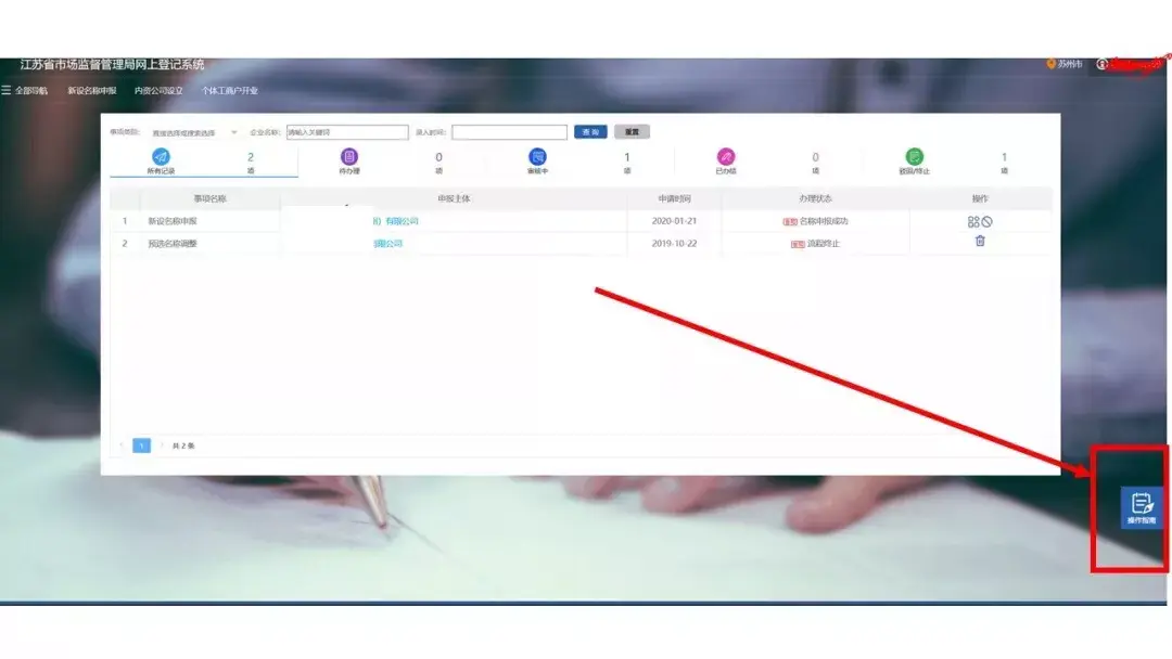 1、登陆成功后会自动跳转至“江苏省市场监督管理局网上登记系统”,要求使用IE8及以上版本浏览器,请注意使用正确的浏览器进行操作,操作中遇到问题可先行参考该页面中的“操作指南”。