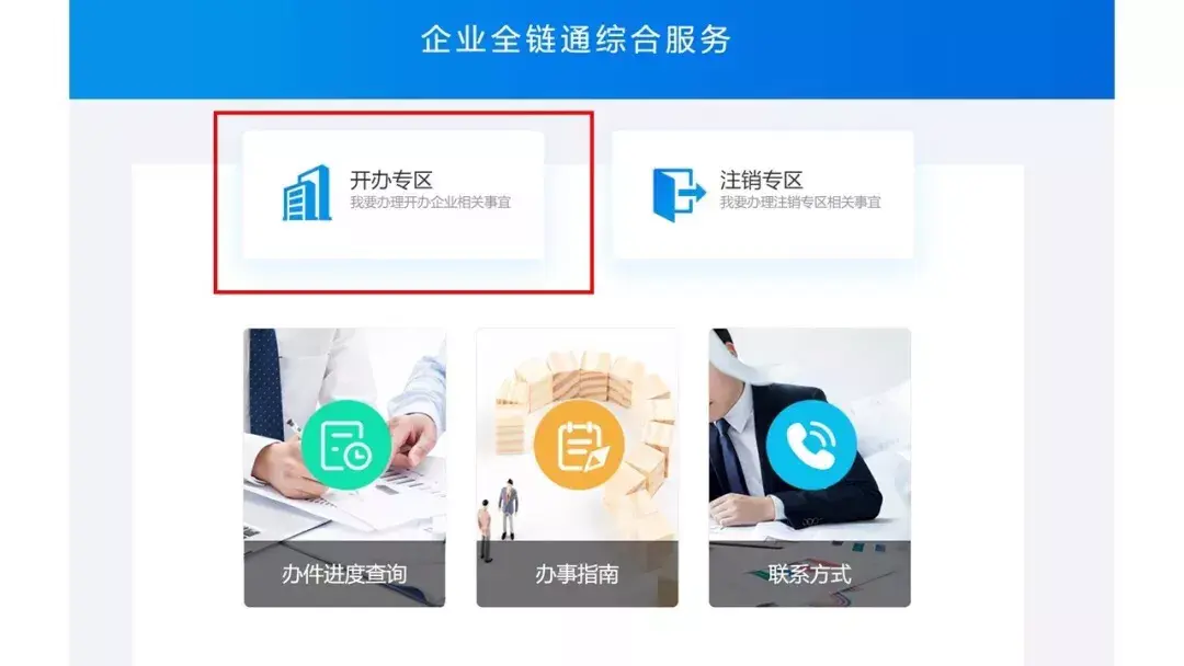 3、在“企业全链通综合服务”选择开办专区。需要办理注销业务的企业可选择“注销专区”,办理注销业务。