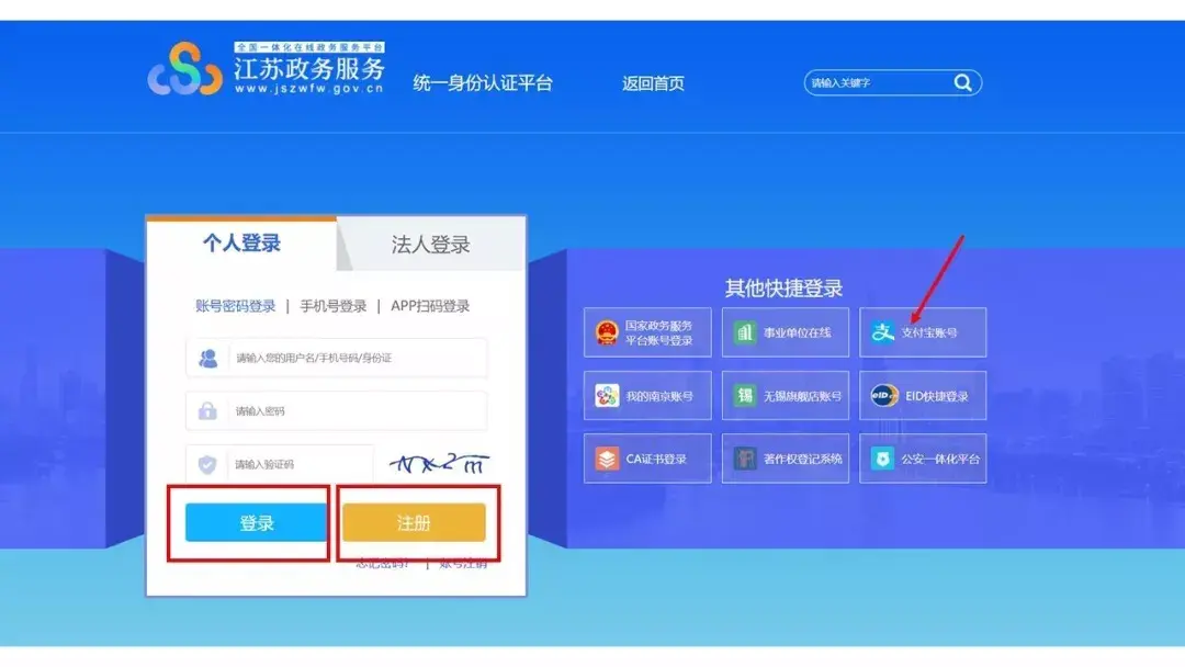 6、政务网新用户请选择“注册”按钮,按照提示注册并完成实名认证,已有账户用户请选择“登录”按钮。也可使用“支付宝账号”登录等其他快捷登陆方式。