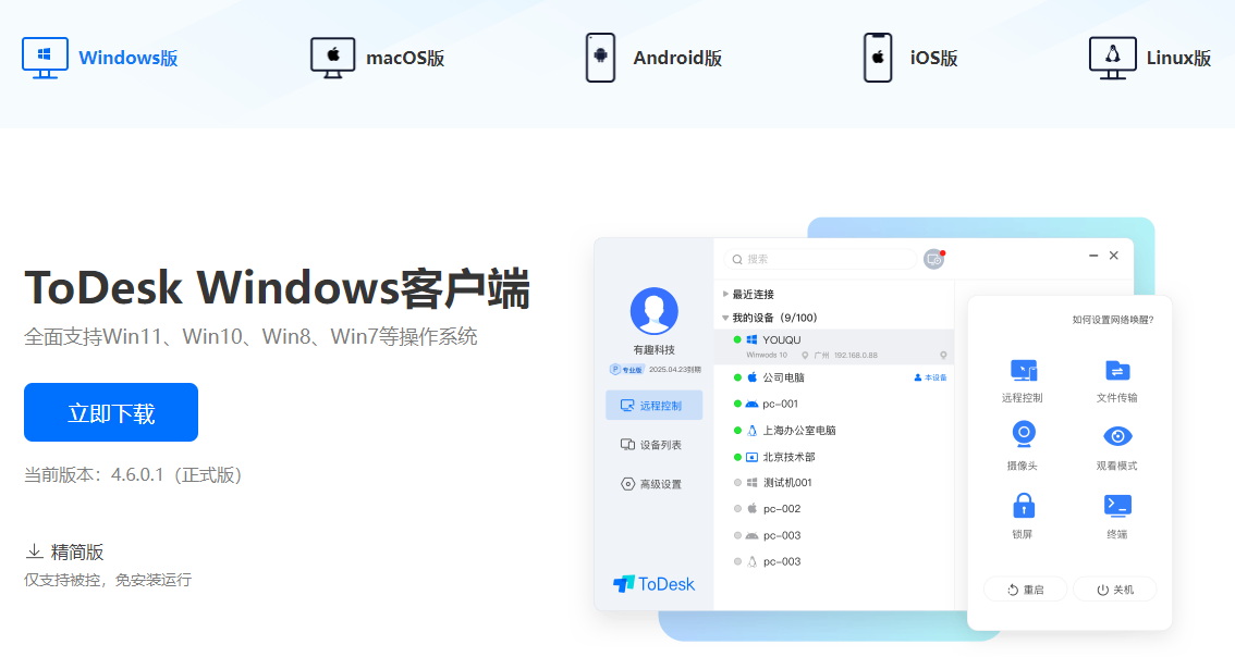 ToDesk算是国内最常用的远控软件之一,也是我用的最多的。当前官网挂的用户数量为五千万+,版本已更新至V4.6.0.1,支持5大平台的互通,其中三个主流电脑操控系统Windows、MacOS、Linux,两个手机操控系统Android与iOS;获取路径通过官网装载应用包或应用商店均可。