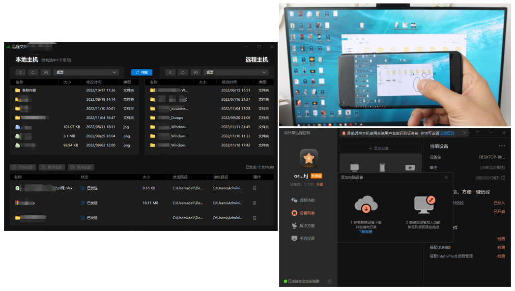 文件传输功能也还算是快的,但不显示传输耗时。添加更多台设备的方式会有点麻烦,todesk是输过点星收藏即可,葵的要再点已加入才行,也是绿点的表示在线,灰点的表示离线,方便网管、运维人员查看设备状态。