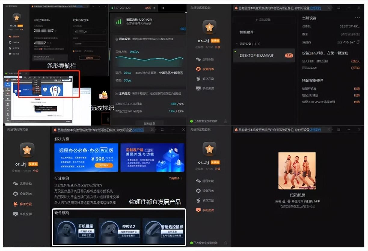 葵是默认的深色的界面,信息比ToDesk放的要多要密,我个人是更喜欢简洁明亮的,但不得不承认向日葵的产品全面性确实做的更加完善。软件、硬件产品都有,开机插座、插线板、鼠标等都有,价格两位数到四位数不等,虽表面上是提供给用户更多样丰富的选择,但实质有间接屏蔽别家硬件、力荐自家,引诱用户做更多消费的成分。在我们使用软件中,却要被迫看这些硬件产品的信息,被干扰,也是他家割韭菜的野心彰显的有点明显了,格局不够,感觉没太重视受众的使用体验。