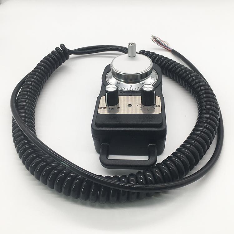 电子手轮主要用于数控机床中的教导式CNC机械工作原点的设定,手动方式的步进微调,加工中的中断插入等动作。其中的波段开关用于轴和倍率的选择,脉冲编码器(ENCODER)用于脉冲的发出便于系统的采集。手摇脉冲发生器(电子手轮)按供电电压、分辨率、信号输出种类不同分类,因而形成适用各类CNC控制系统的手持单元。