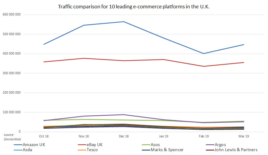 (图:2019年英国Top10电商平台的流量比较)