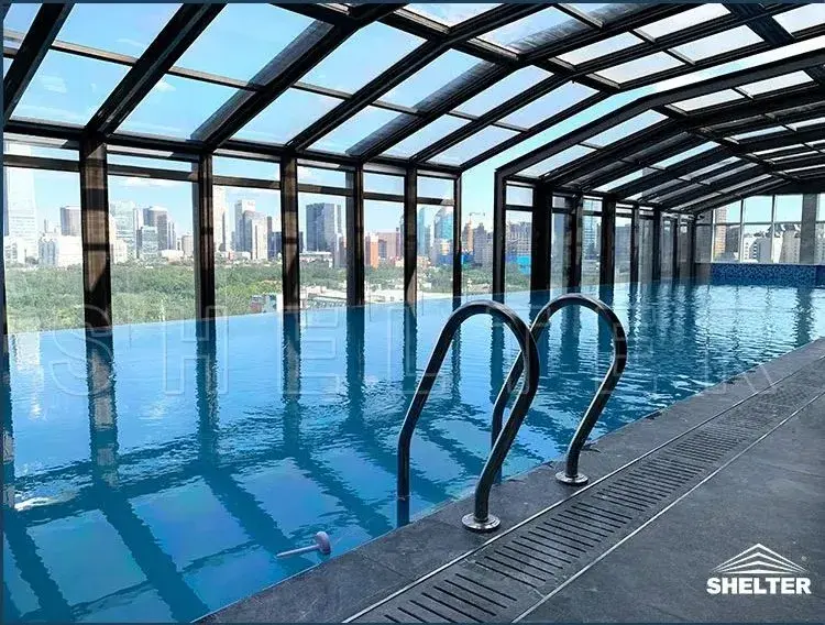 ▲赛尔特阳光房项目——北京福庭酒店无边泳池智能滑道伸缩移动阳光房