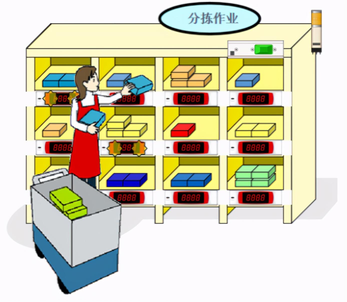 将电子标签安装于货架储位上,一个储位放置一项产品,即一个电子标签代表一项产品,并且以一张拣货单为一次处理的单位,系统会将拣货单中有拣货商品所代表的电子标签亮起,拣货人员依照灯号与显示数字将货品从货架上取出放进拣货箱内,此为摘果式拣货。
