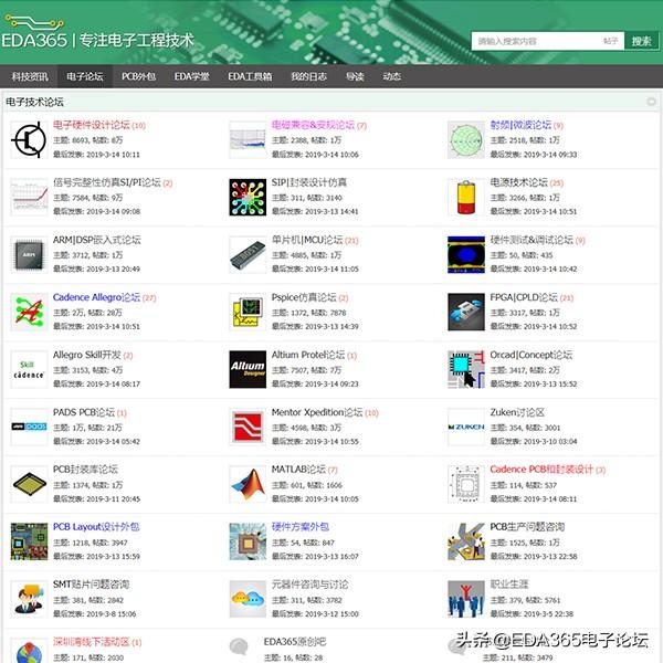 论坛覆盖了各电子工程知识模块如电子电路设计论坛,电路原理图设计,单片机论坛,SI信号完整性仿真,Cadence工具与Allegro论坛,PCB论坛,Altium Protel论坛、Mentor PADS论坛、嵌入式开发、Layout与PCB设计软件资料下载,电源&电路理论等等,EDA365版主们主要来自华为、中兴、思科、Intel等世界500强公司。