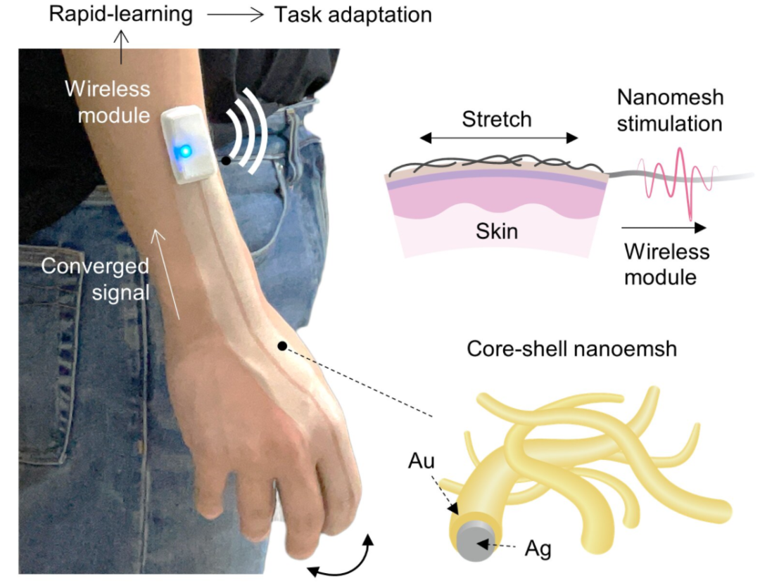 研究人员描述,这种材料可像防晒喷雾一样喷洒在手背上,并在此集成了一个微型电子网络 ,它可感知皮肤伸展和弯曲。通过使用人工智能(AI),研究人员可根据手部动作和手势解释无数的日常任务。