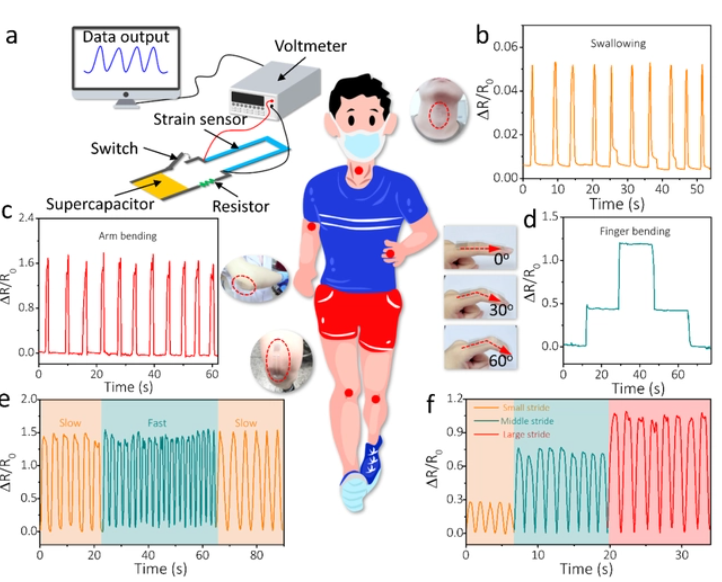 在它系统内“岛桥结构”应变传感器 和“隐身电源”超级电容器 的加持下,电子皮肤能够无视形变和范围的影响,传感性能依旧;贴敷在人体皮肤上,还能实时监测人体活动,脉搏、吞咽、肢体运动等微弱生理信号都能检测到,简直变成了“超级皮肤”。