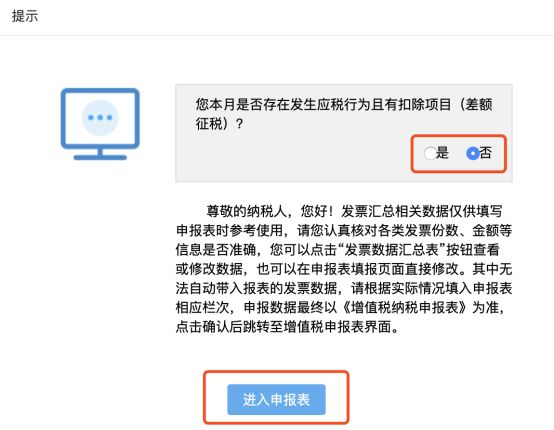 3、进入在线申报后,系统将弹出“是否存在发生应税行为且有扣除项目(差额征税)?”,默认为否,点击“进入申报表”
