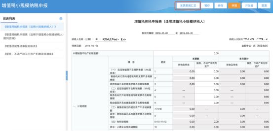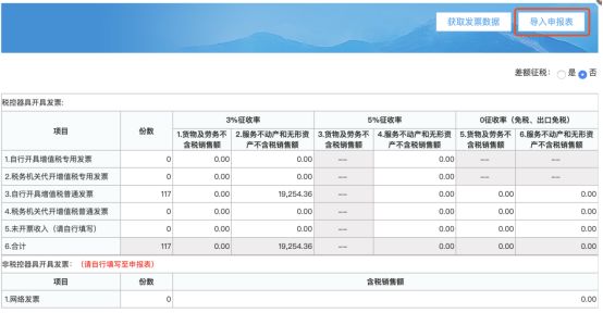 6、确认无误后,点击“导入申报表”;若有误(发票数据传输可能会延迟),可直接在发票采集界面进行修改,再导入申报表。(其中电子网络发票数据因没有税收分类编码,需要纳税人根据发票数据自行计算后填入申报表相应栏次。)