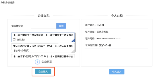 在“请选择企业”框内输入需要进行增值税小规模申报的企业,点击“企业进入”