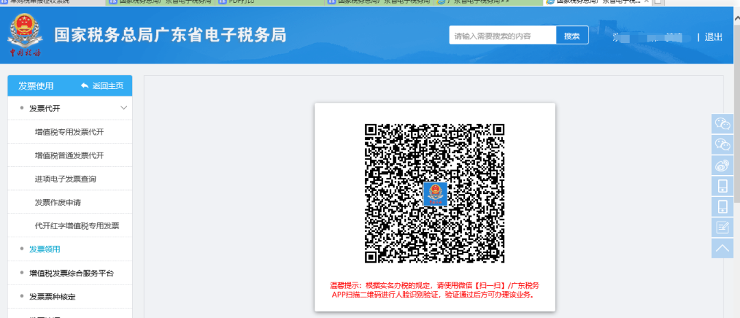 在登录环节扫码刷脸登录验证通过后,在【发票领用】办理环节将无需重复校验办税身份,所以为了您更顺畅的办理各发票类业务,建议在登录环节优先使用扫码刷脸登录方式!
