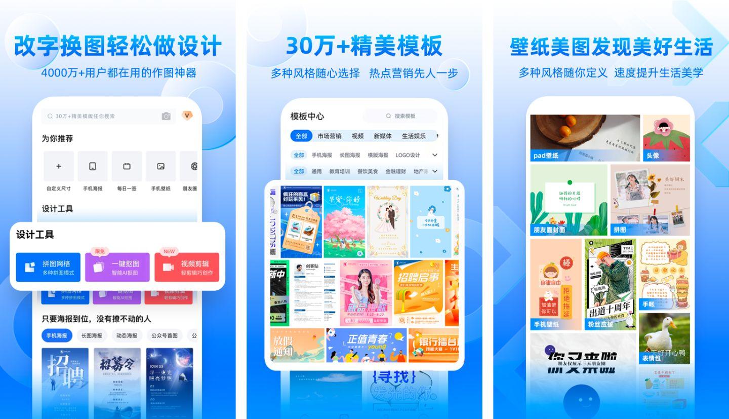 30w+精美模板,海报、长图、日签、公众号首图、小红书封面、简历、名片、邀请函,电商海报、手抄报、LOGO、壁纸、头像、朋友圈封面等100+场景。无论是企业营销、微商获客、 电商引流、壁纸美化,都能轻松满足需求。