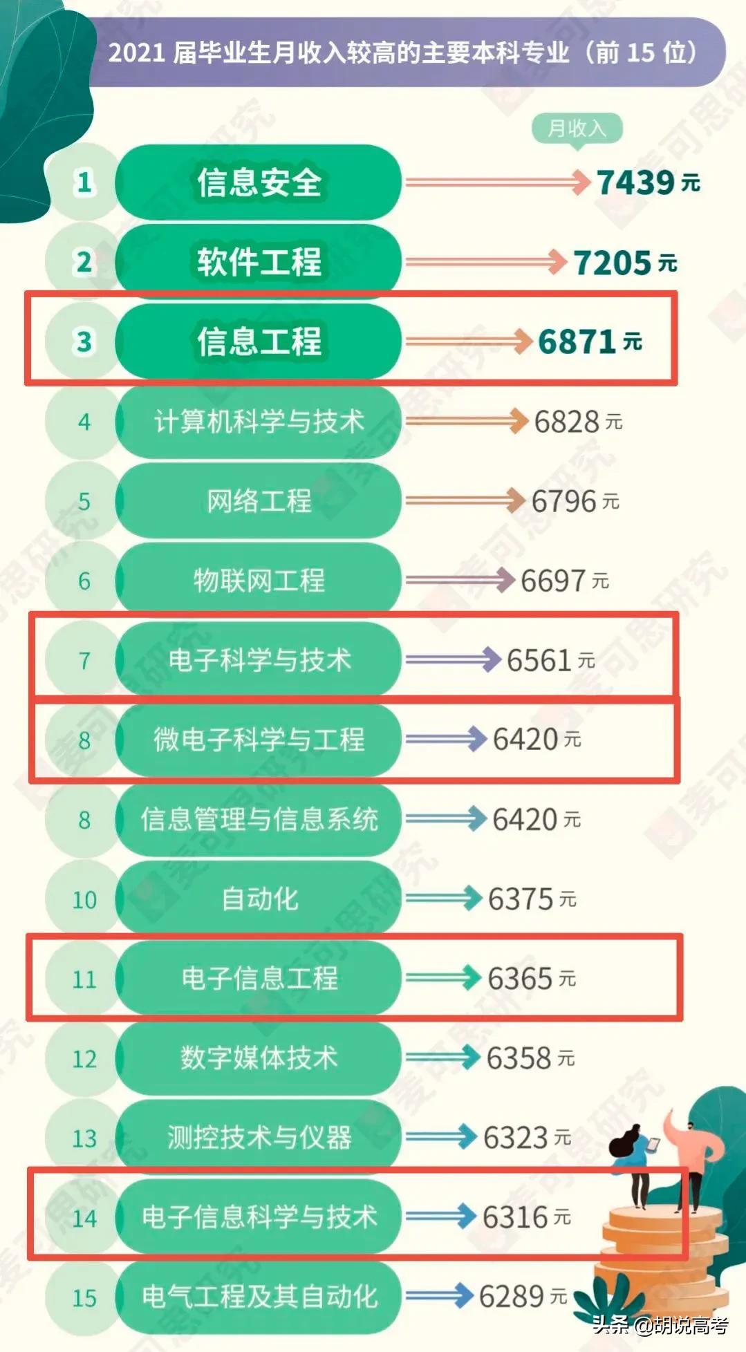 另一张图表是麦可思研究院发布的2021届中国大学生就业报告,其中前15位高薪榜中,电子信息类专业就占有5位。