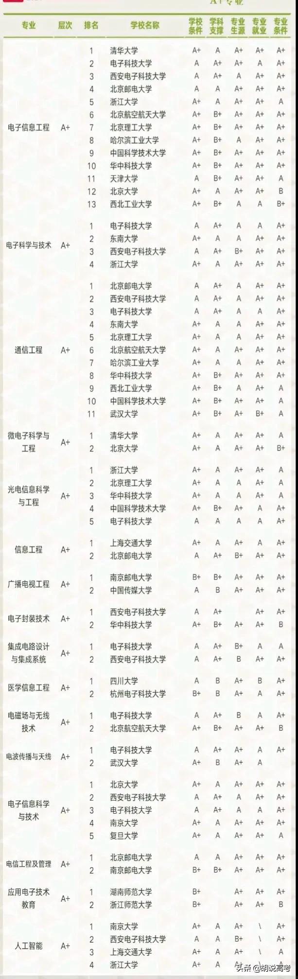 最后,给大家看看两张数据表。一张是软科2021电子信息类各A+专业实力高校排名,基本反映了高校教研水平,填志愿选专业时可以做参考。