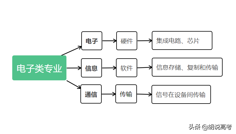 电子信息类专业研究方向,分为“电子”、“信息”和“通信”三大方向。“电子”研究的方向属于硬件领域,也就是集成电路;“信息”研究的方向属于软件领域,即是研究信息在集成电路中的存储、复制和传输;而“信号”在不同设备之间的传输过程则称为“通信”过程。不同专业在三个方向的侧重点不同。