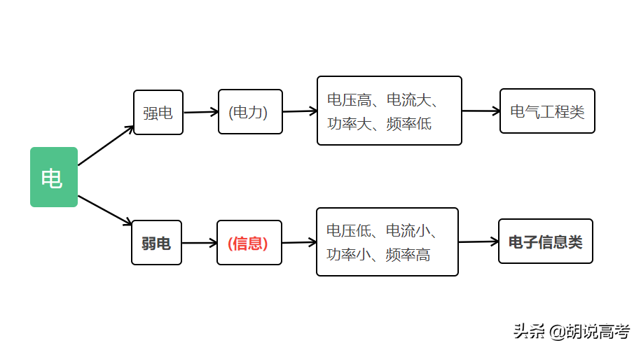 人们习惯将电分为强电(电力)和弱电(信息)两部分。两者既有联系又有区别,一般来说强电的处理对象是能源(电力),其特点是电压高、电流大、功率大、频率低,主要考虑的问题是减少损耗、提高效率;弱电的处理对象主要是信息,即信息的传送和控制,其特点是电压低、电流小、功率小、频率高,主要考虑的是信息传送的效果问题。