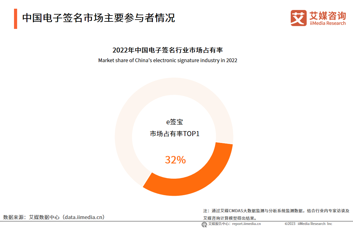 目前中国电子签名行业主要参与者类型包括传统CA机构、互联网企业、电子签名独立厂商等。数据显示,2022年 e签宝 市场占有率为32%,位居行业第一 。艾媒咨询分析师认为,用户在选择电子签章平台上,更偏向于大品牌、可信赖的电子办公服务提供商。