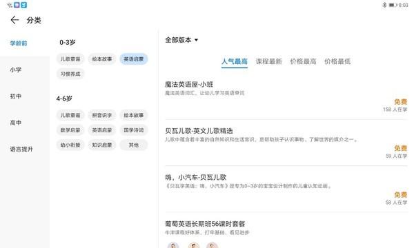 进入教育中心,映入眼帘的是沉浸式的学习桌面,桌面下方分别是推荐、学习和应用。在推荐页面中,更像是手机的负一屏,在不同的功能卡片聚合了与学习有关的信息,例如在智慧评测中,可以对儿童英语水平和词汇量进行测试。用户在页面中还可以选择免费试课、课程专题、品牌好课。在免费试学中,精品课程免费试学,课程专题页面里,时令热点专题同步更新,而品牌好课更是汇集了知名线上教育品牌,包含直播、录播、点读、游戏化教学等,依托强大的师资团队为孩子提供形式多样的品质课堂。