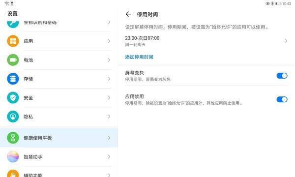 在健康使用平板中,还可以对屏幕使用时长进行设置,控制孩子每天使用平板电脑的时间,还可以设置停用时间,时间一到后让孩子脱离平板电脑,放松眼睛,换换脑子,以更好地状态投入到下一次学习当中。在这其中,还可以查看每个App的使用时间,方便家长了解孩子每天都使用哪些应用,用了多长时间。