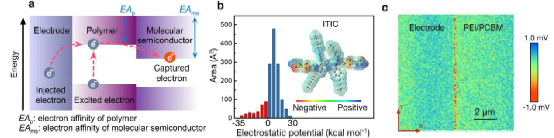 a:聚合物-分子半导体复合体系能级与电荷转移示意图 b:分子半导体静电势分布 c:电极/聚合物界面表面电势分布