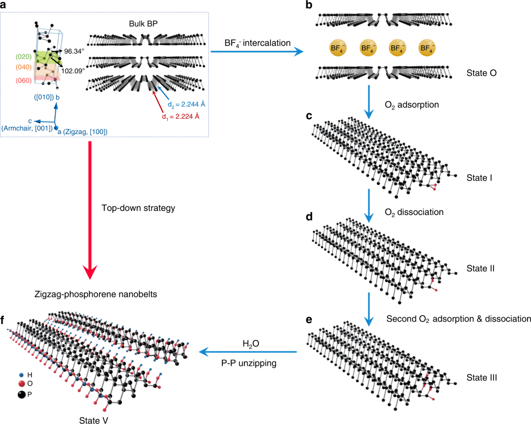 该电化学解离机制认为制备过程分为两步,即离子插层和氧驱动解离过程(图2)。在电化学过程中,BF4-离子沿黑磷a轴方向(即[100]方向,沿zigzag方向)插入黑磷晶体层间,同时,氧分子被化学吸附、解离在黑磷表面上形成悬键氧,通过悬键氧与水分子形成氢键及P-O-P水解,导致P-P键断开,沿着zigzag方向以“拉开拉链”的方式持续进行,被解离成纳米带。理论计算分析、比较了各种氧分子在黑磷烯上的吸附和解离路径(图3)。结果表明,形成间隙氧对是解离黑磷晶体P-P键并最终形成zigzag取向黑磷烯纳米带的关键步骤。