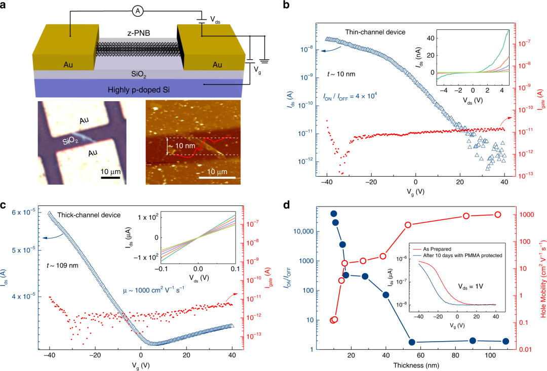 研究团队采用铜网掩膜法设计制备了基于黑磷烯纳米带的场效应晶体管器件并探究了其载流子输运特性,可实现器件p-n型之间的转化,为黑磷烯纳米带在主动式矩阵显示技术、射频器件及互补型金属氧化物半导体器件技术中的应用提供了关键材料和开辟新的研究方向。