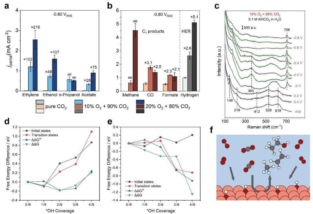 图1. (a) -0.8 VRHE下多碳产物分电流密度;(b) -0.8 VRHE下一碳产物分电流密度;(c)加氧气共同电解原位拉曼光谱图;(d) DFT计算多碳产物生成决速步;(e) DFT计算甲烷生成决速步;(f)共同电解过程示意图。