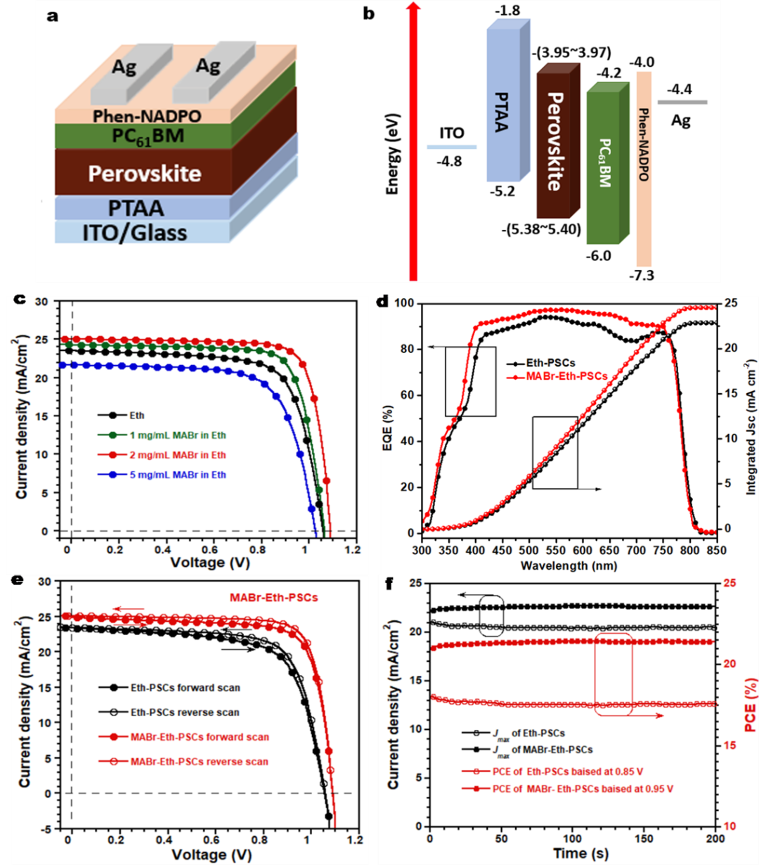 通过使用溶解在乙醇(Eth)的MABr(MABr-Eth)作为绿色反溶剂处理的钙钛矿薄膜,既增加晶粒尺寸以及钙钛矿的结晶度,又可以钝化表面缺陷;再者,MABr可与由乙醇洗涤分解Cs0.15FA0.85PbI3生成的PbI2反应,避免钙钛矿损失,增强光的吸收。此情况下,制备的反式平面异质结器件ITO/PTAA/Cs0.15FA0.85PbI3/PC61BM/Phen-NADPO/Ag的最佳能量转换效率(PCE)为21.53%。此外,相应的PSCs具有更好的存储和光稳定性。