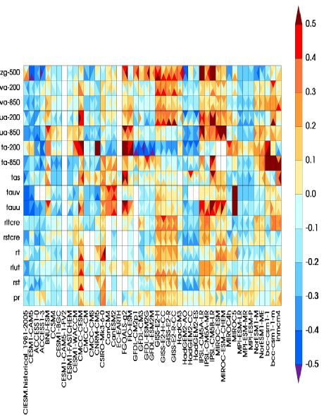 采用气候模式诊断和比较计划(PCMDI)标准诊断包分析的清华大学联合地球系统模式历史模拟性能和其他CMIP5模拟的比较(全球平均)。颜色代表模式均方根误差相对于多模式平均偏差的差异,颜色越蓝性能越好。一个方格内的四个三角形代表春夏秋冬。第一列为清华大学联合地球系统模式,不同行表示不同的变量。