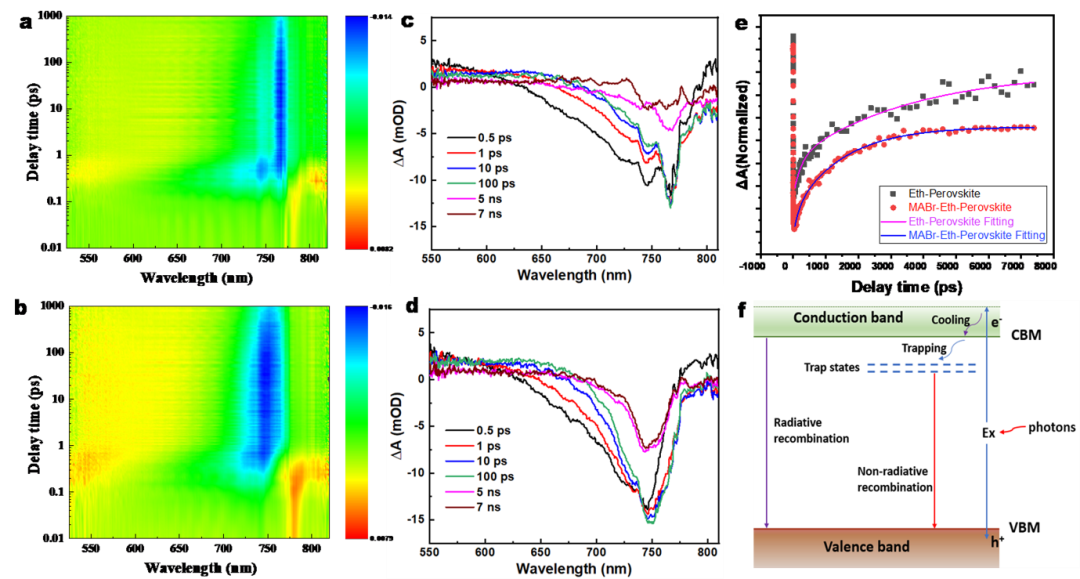 图3 钙钛矿薄膜飞秒瞬态吸收光谱和可能的激子捕获和复合过程