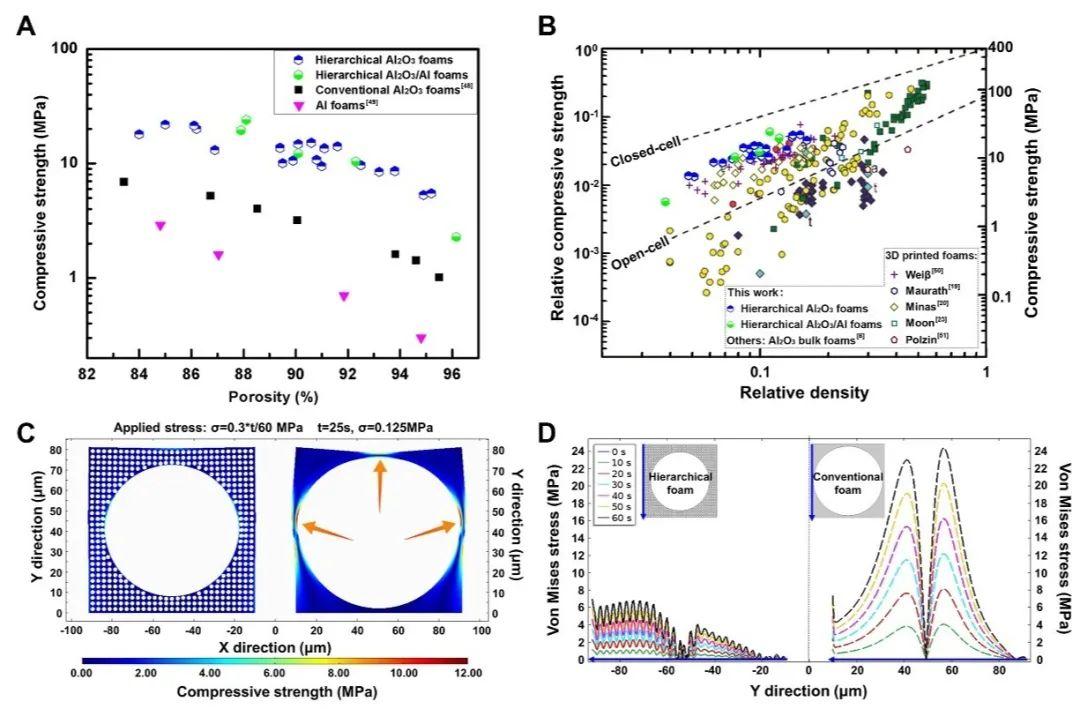 相关研究成果申请发明专利,并以“通过胶体自组装和金属颗粒氧化构筑的超强多级孔材料”(Ultra-strong hierarchical porous materials via colloidal assembly and oxidation of metal particles)为题发表在期刊《先进功能材料》(Advanced Functional Materials)。主编和审稿人对该研究工作给予高度评价:“此篇文章应作为非常重要的文章(VIP)发表。该文章的工作是材料的科学与技术两方面的重大进步,这种新型构筑陶瓷材料的过程可以制备比其他方法具有更高强度的氧化铝泡沫陶瓷,特别是对于高气孔率(气孔率在85%-95%之间的)泡沫陶瓷来说。该文章报道的制备多维度近零尺寸收缩的泡沫陶瓷,从经济化角度来看,对制造复杂形状器件具有重大意义。文章中有许多科学性创新。例如利用克肯达尔效应得到的空心球制备宏观陶瓷坯体的想法,是非常具有创造性的;通过控制烧结过程中坯体收缩/膨胀的平衡来实现体积的近零收缩的做法,对于陶瓷制备工艺具有重大贡献。文章中将此方法结合于3D打印技术、冷冻注模、凝胶注模等方法,为这种方法在制备复杂形状器件方面的应用奠定了基础。”
