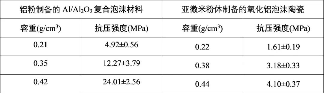 表1 烧结不收缩Al/Al2O3复合泡沫材料与传统亚微米粉体制备的氧化铝泡沫陶瓷对比