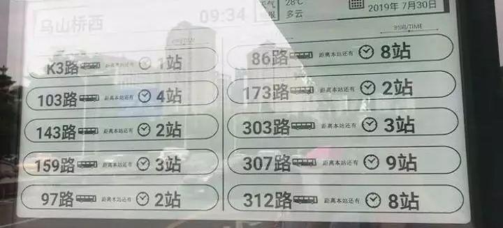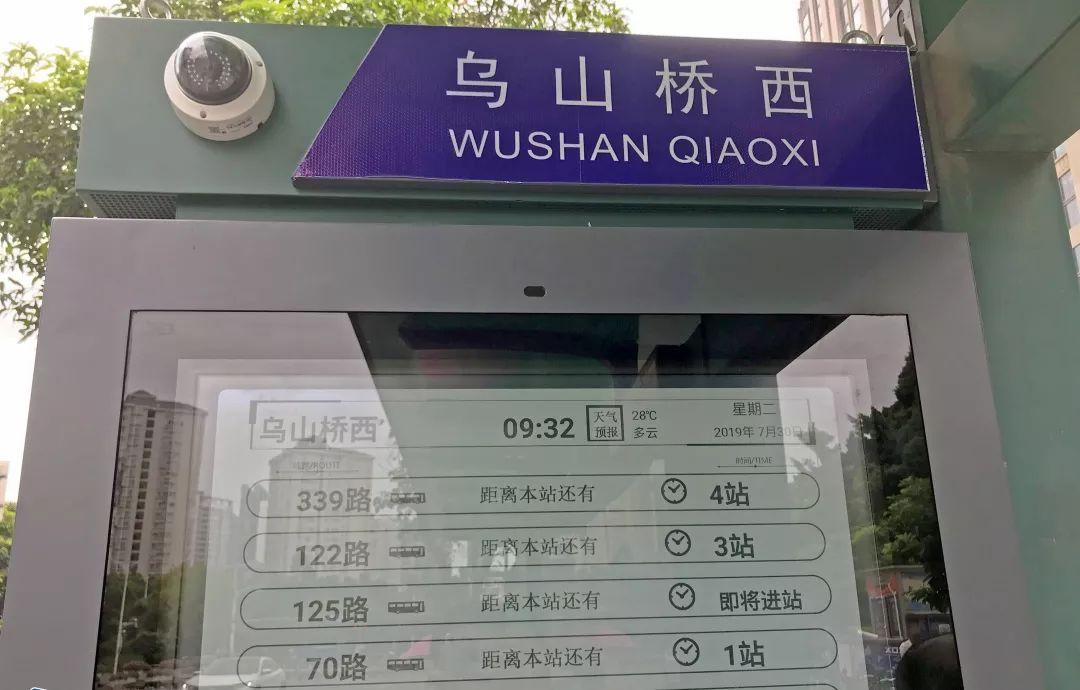 记者在乌山桥西南侧公交站看到,传统站牌上方安装了一块屏幕,上面显示了站名、时间、天气,各路公交车到站距离等信息。