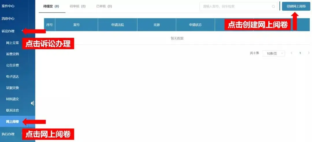 登录后,在“电子诉讼平台诉讼办理” 模块中,点击“网上阅卷” ,进入网上阅卷模块,点击“创建网上阅卷” ,勾选阅卷须知后,准备创建网上阅卷。