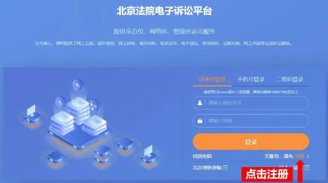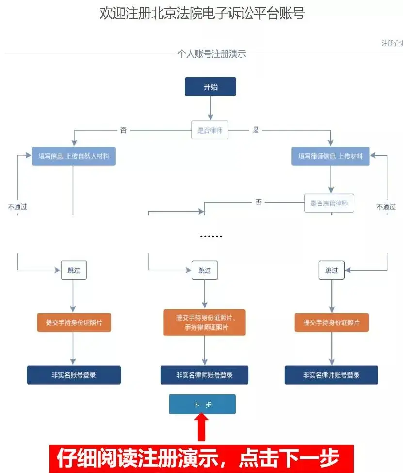 首次进入北京法院电子诉讼平台的用户,必须先进行注册,在首页点击注册,阅读注册须知,按照指引进行注册。