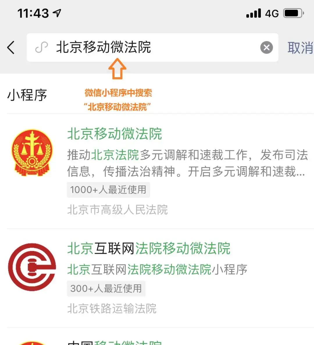 打开微信,在小程序中搜索“北京移动微法院” ,点击打开。