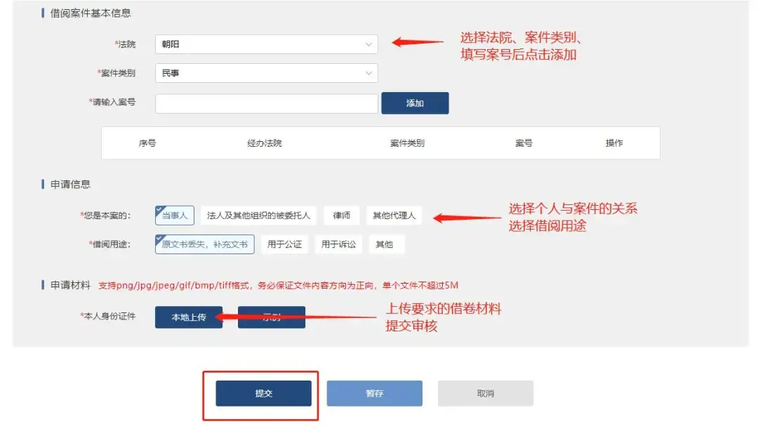 在借阅案件申请界面填写借阅案件基本信息,包括法院、案件类别和案号 ,注意案号格式填写正确,填写完成后点击添加,如果格式正确案件会到借阅列表中,继续进行申请信息的填写,包括个人与案件的关系和借阅用途 ,并按照系统要求的申请材料进行材料上传,提交即完成借阅申请。