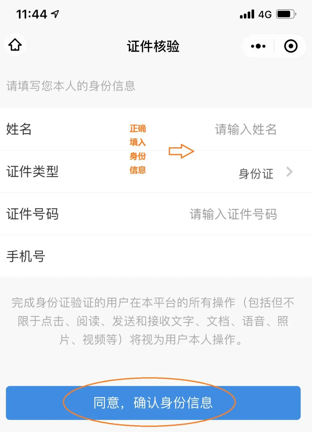 绑定手机号码后,进行身份核验,输入身份证件信息,确认身份信息后进入人脸识别核验。