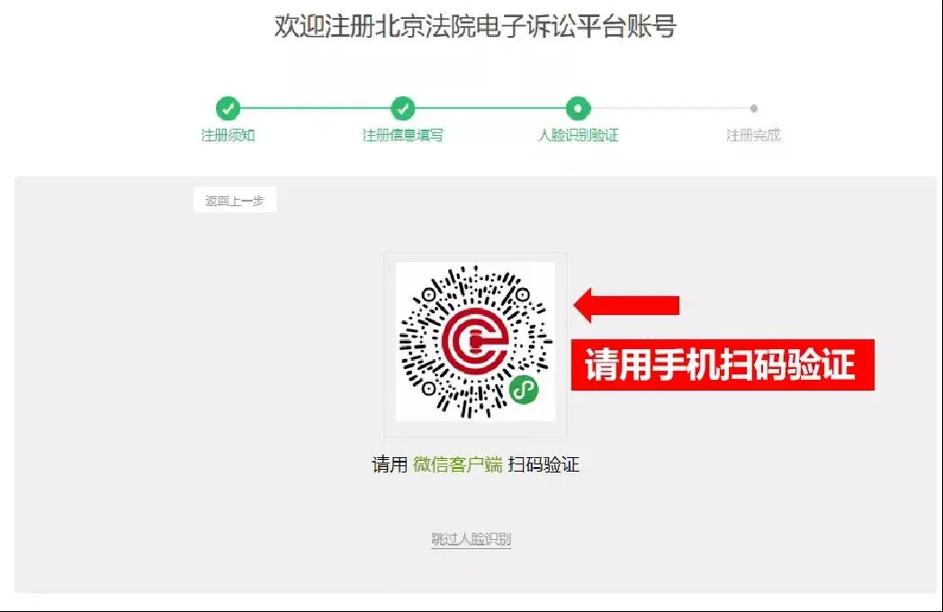 个人信息填写完成后,点击下一步进入人脸识别验证过程,使用手机扫描页面上的二维码,按照指引进行人脸验证。验证完成后整个注册过程完成。注册完成后进行登录。