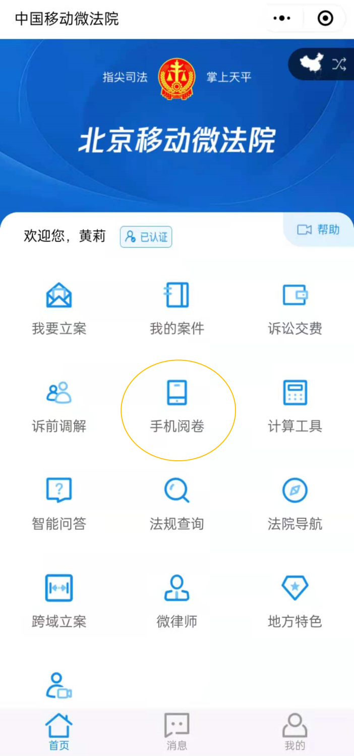 登陆后,在北京移动微法院首页,点击“手机阅卷” ,进入手机阅卷模块。
