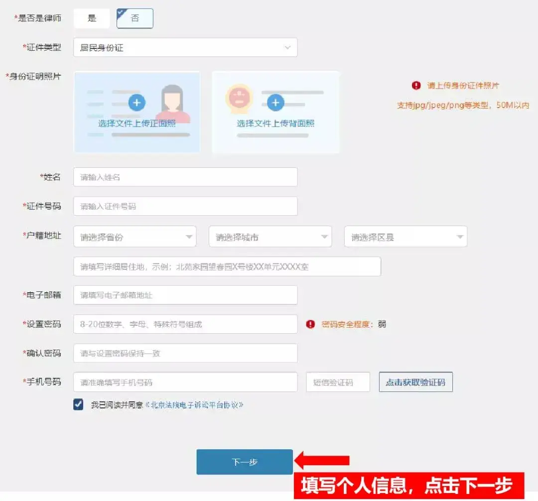 阅读完成注册演示后,点击下一步,进入注册界面,按照要求填写个人注册信息,完成注册。